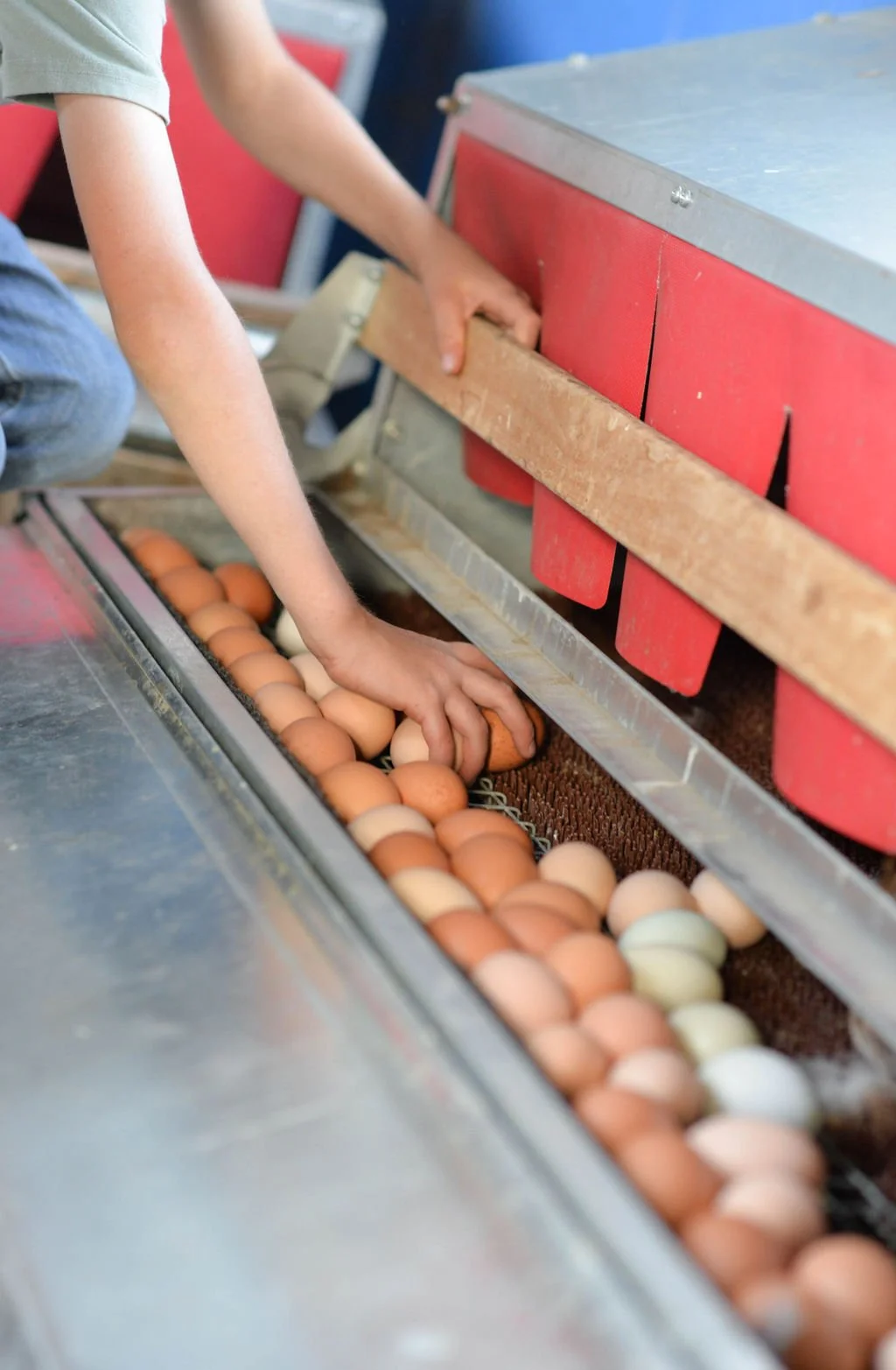 The laying hens are free ranging and go into a portable chicken coop at night for safety from predators. It has a mesh floor for their manure to fall through as fertilizer in the pastures and fields. This also keeps their shelter clean. The portable trailer has free choice, non-GMO grain available for them to supplement their diet as they need it. We move the trailer every few days following the cows. Eggs are collected daily.